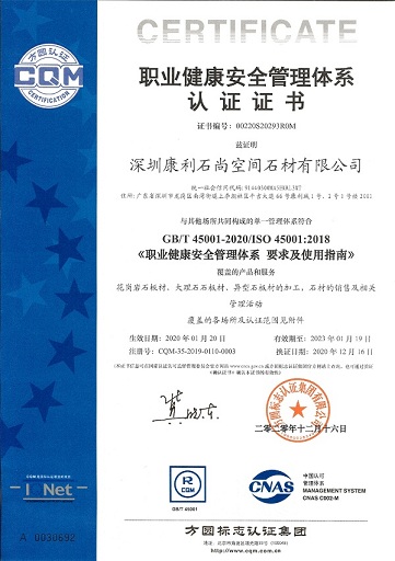 康利建立了完善的質(zhì)量保證體系,是行業(yè)中率先通過(guò)ISO9001質(zhì)量管理體系認(rèn)證、ISO14001環(huán)境管理體系認(rèn)證的企業(yè),并且是石材國(guó)家標(biāo)準(zhǔn)《天然大理石建筑板材》、《天然花崗石建筑板材》的起草單位之一。